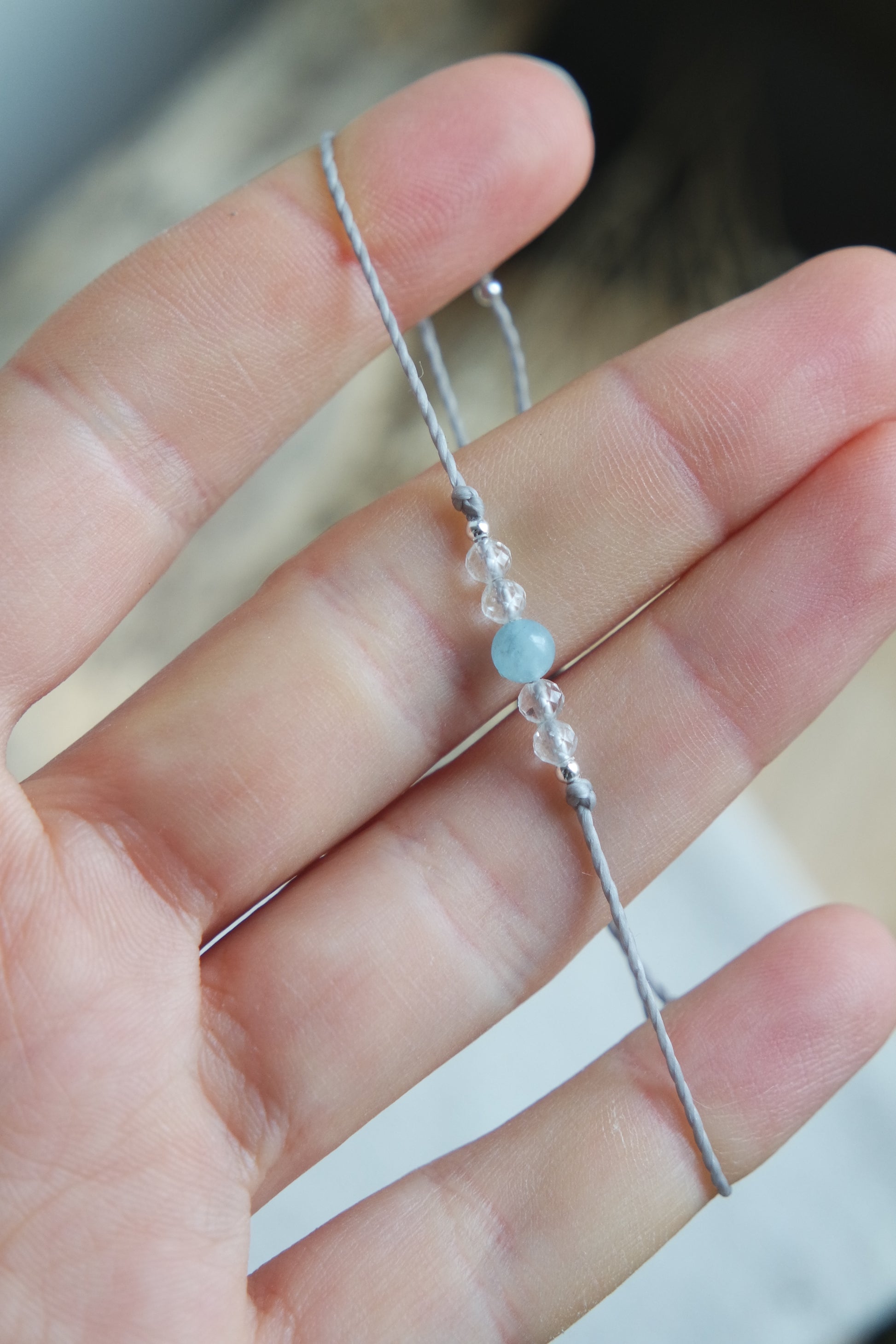 Handgefertigtes Makramee Armband mit 4mm Aquamarien Perle, 3mm Bergkristall facettierten Perlen und 925 Silber Perlen.