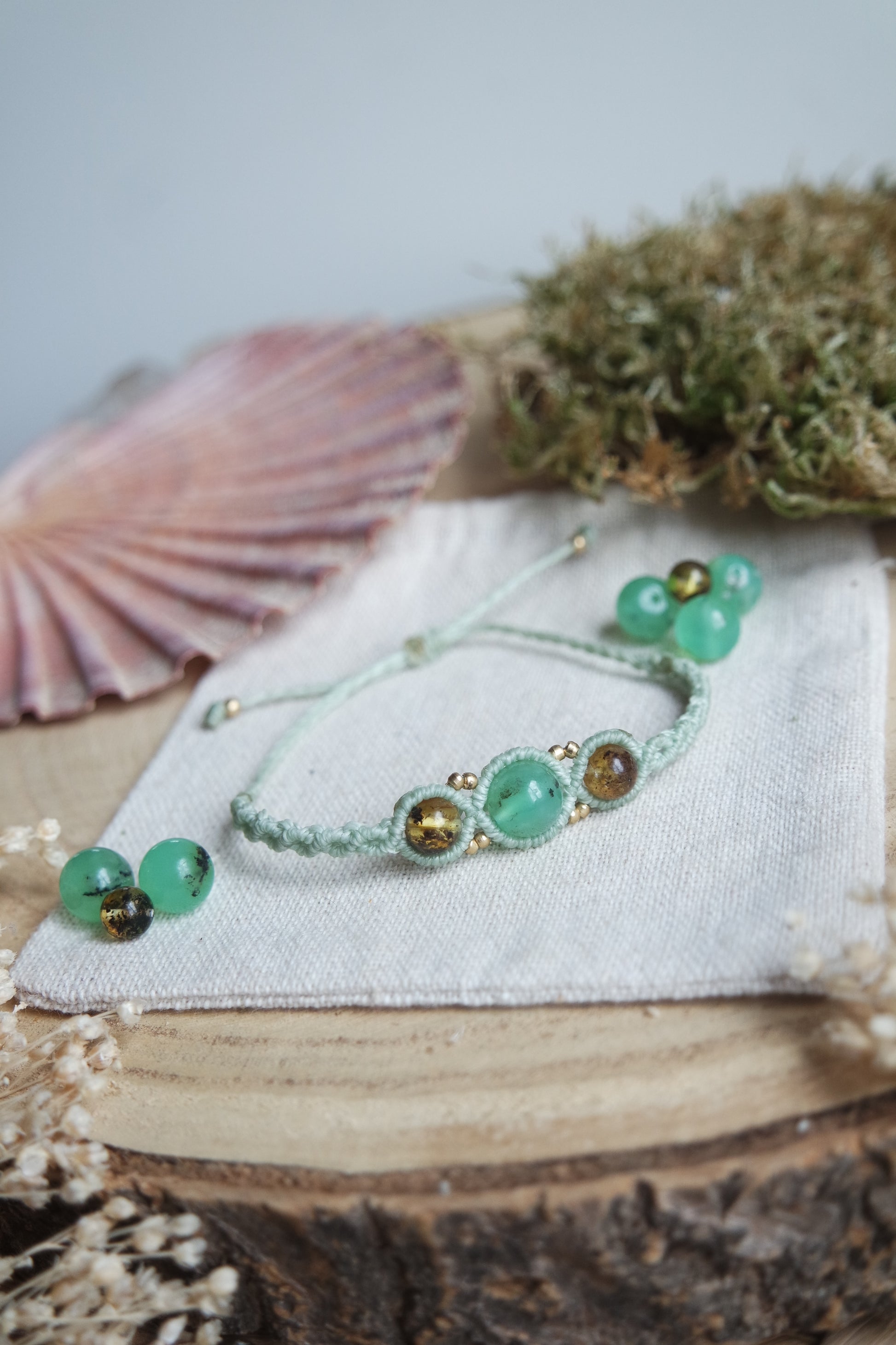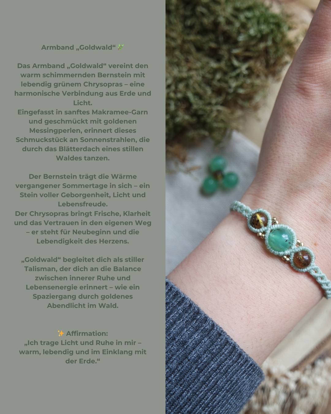 Das Armband „Goldwald“ vereint den warm schimmernden Bernstein mit lebendig grünem Chrysopras – eine harmonische Verbindung aus Erde und Licht. Eingefasst in sanftes Makramee-Garn und geschmückt mit goldenen Messingperlen, erinnert dieses Schmuckstück an Sonnenstrahlen, die durch das Blätterdach eines stillen Waldes tanzen. Der Bernstein trägt die Wärme vergangener Sommertage in sich – ein Stein voller Geborgenheit, Licht und Lebensfreude. Der Chrysopras bringt Frische, Klarheit und das Vertrauen in den eigenen Weg – er steht für Neubeginn und die Lebendigkeit des Herzens. „Goldwald“ begleitet dich als stiller Talisman, der dich an die Balance zwischen innerer Ruhe und Lebensenergie erinnert – wie ein Spaziergang durch goldenes Abendlicht im Wald.