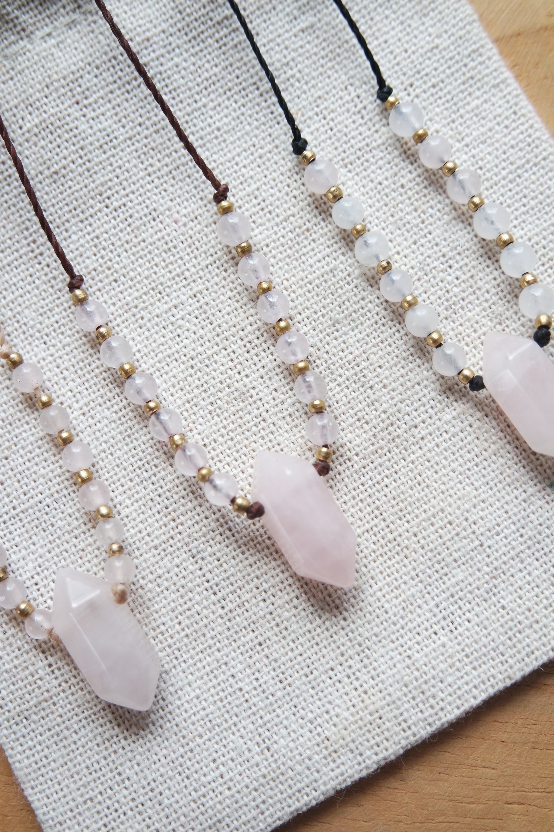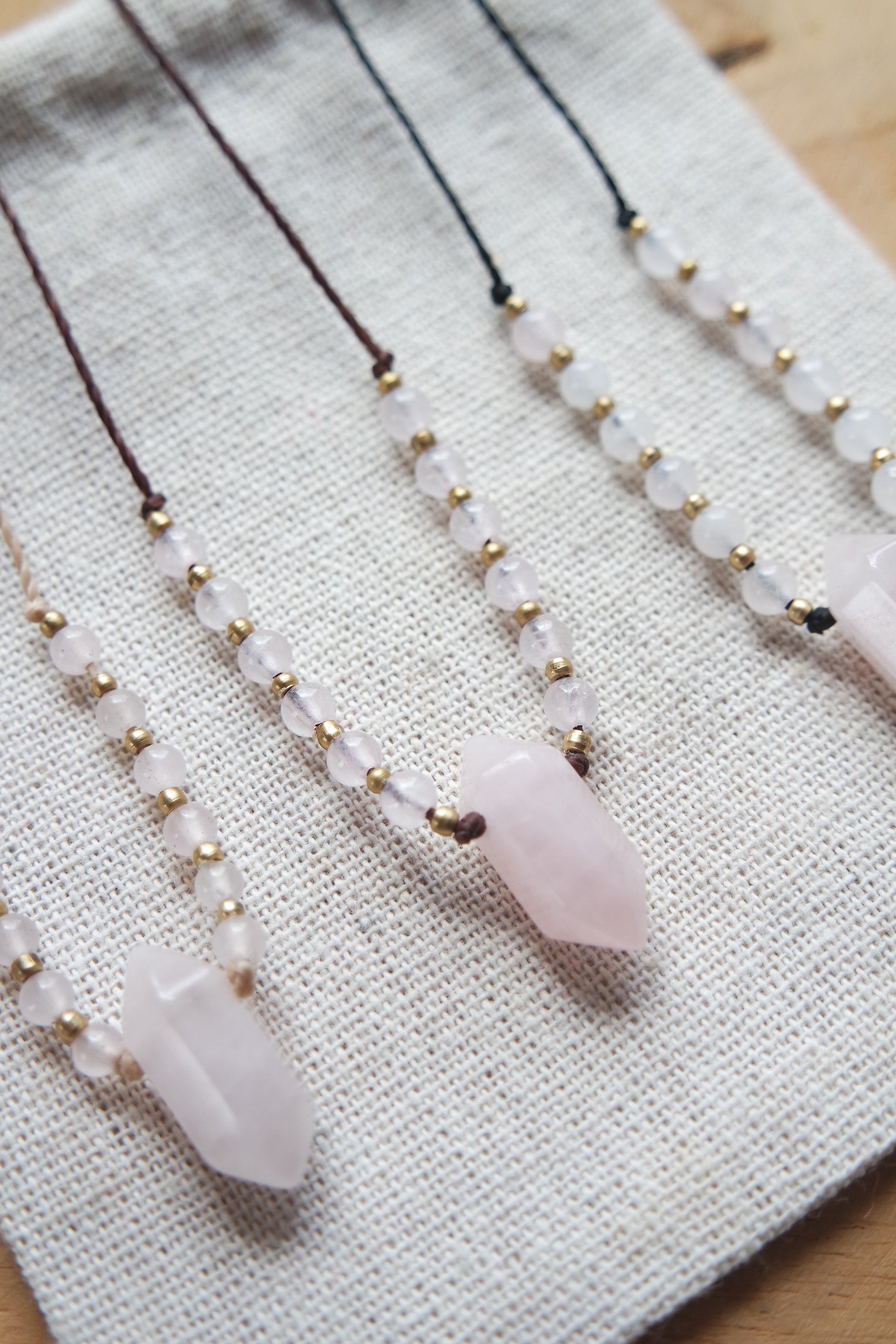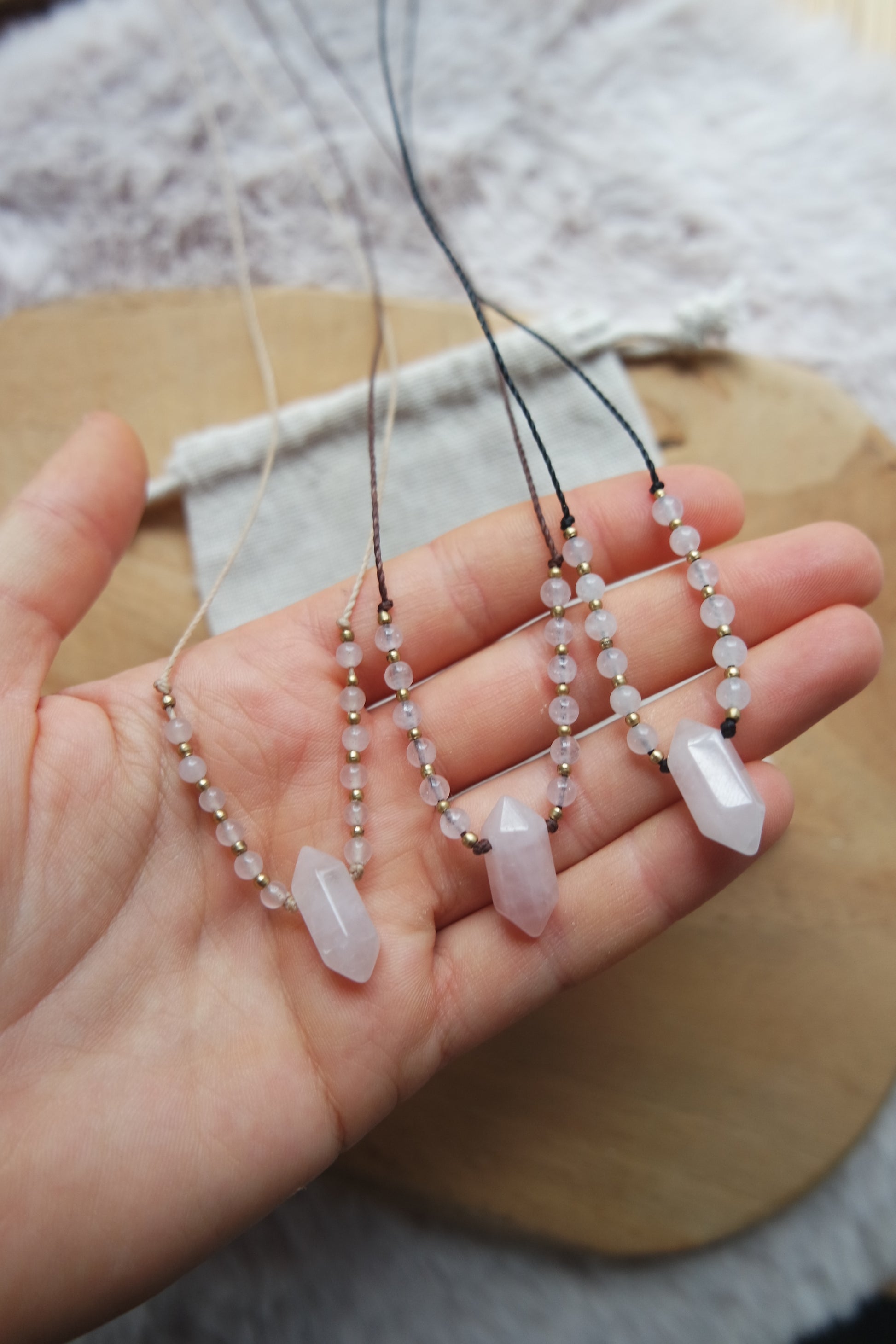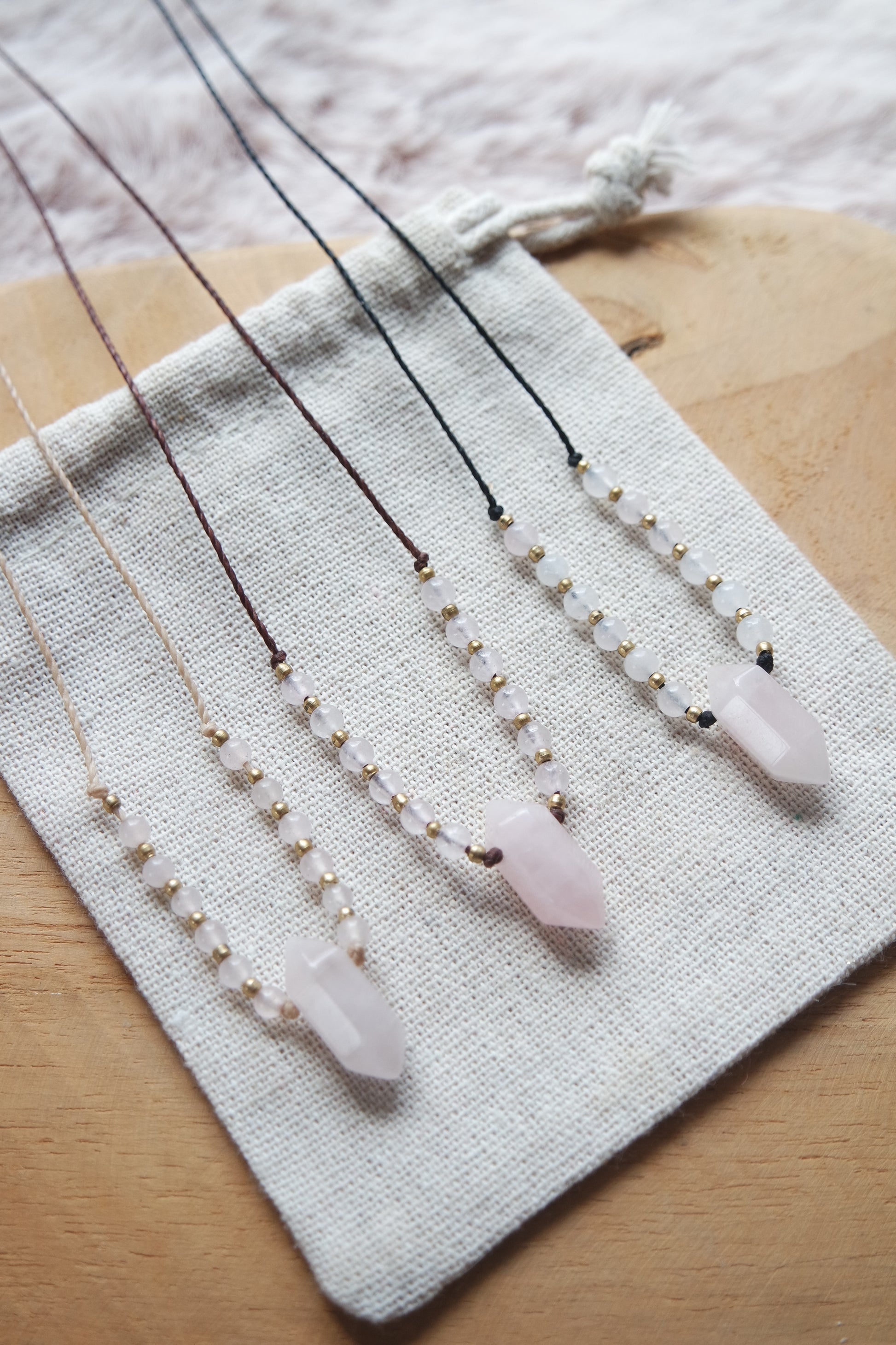 Zart, schlicht und voller Wärme – diese handgeknüpfte Kette aus Rosenquarz vereint sanfte Natürlichkeit mit feinen Details.