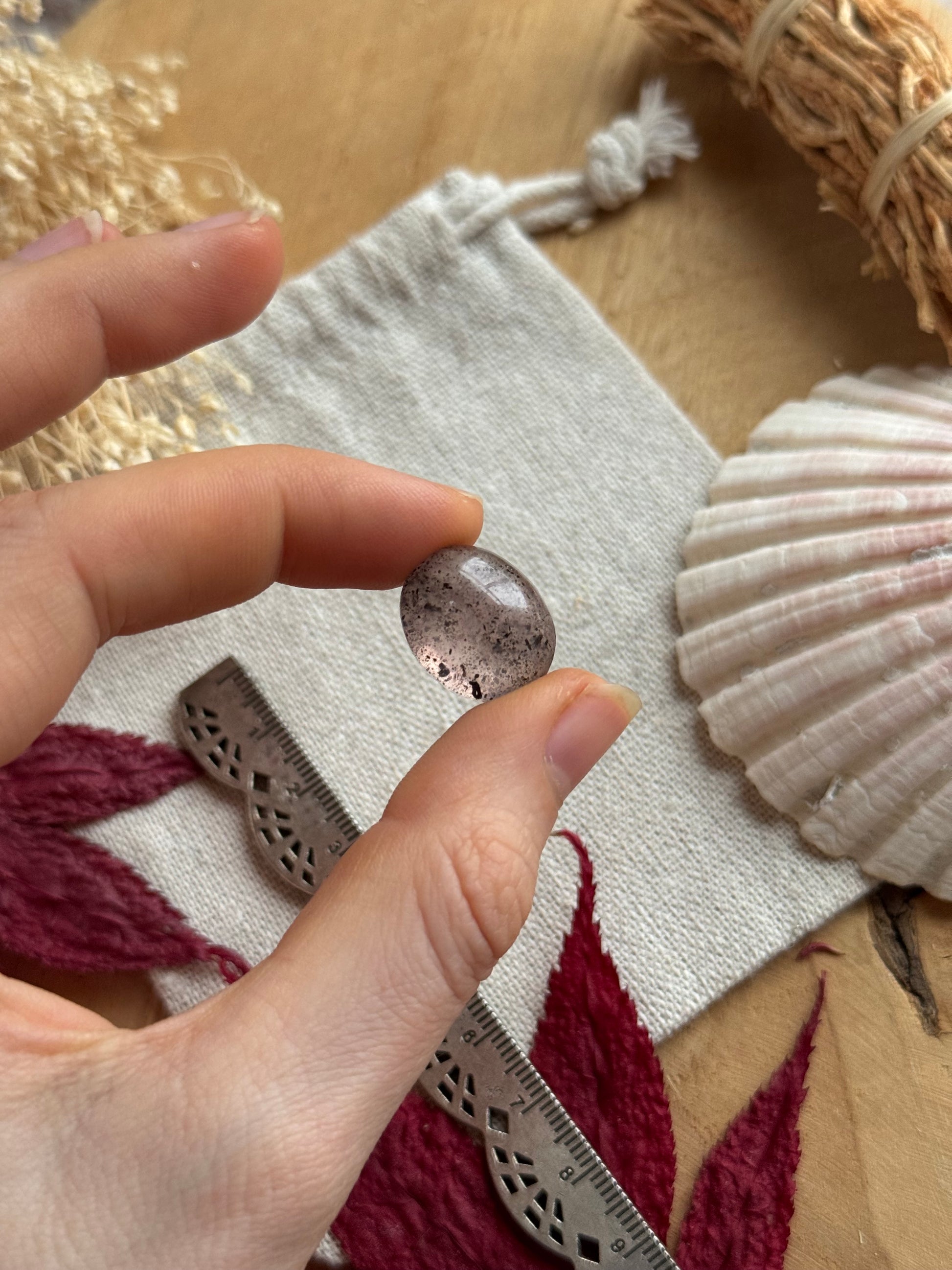 Drachenfruchtquarz (Saponit in Quarz) mit zarten Einschlüssen, die dem Stein Tiefe und Individualität verleihen.