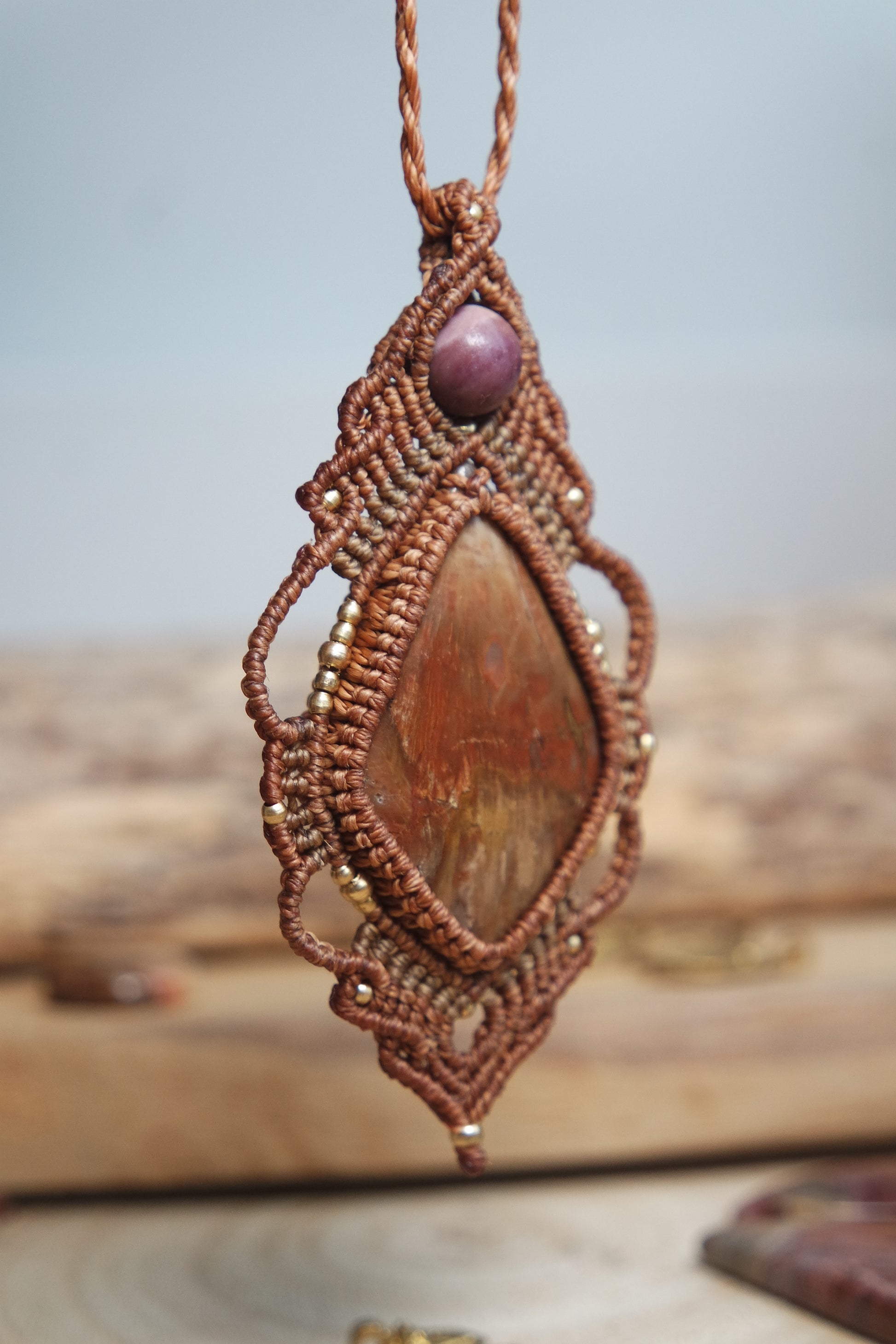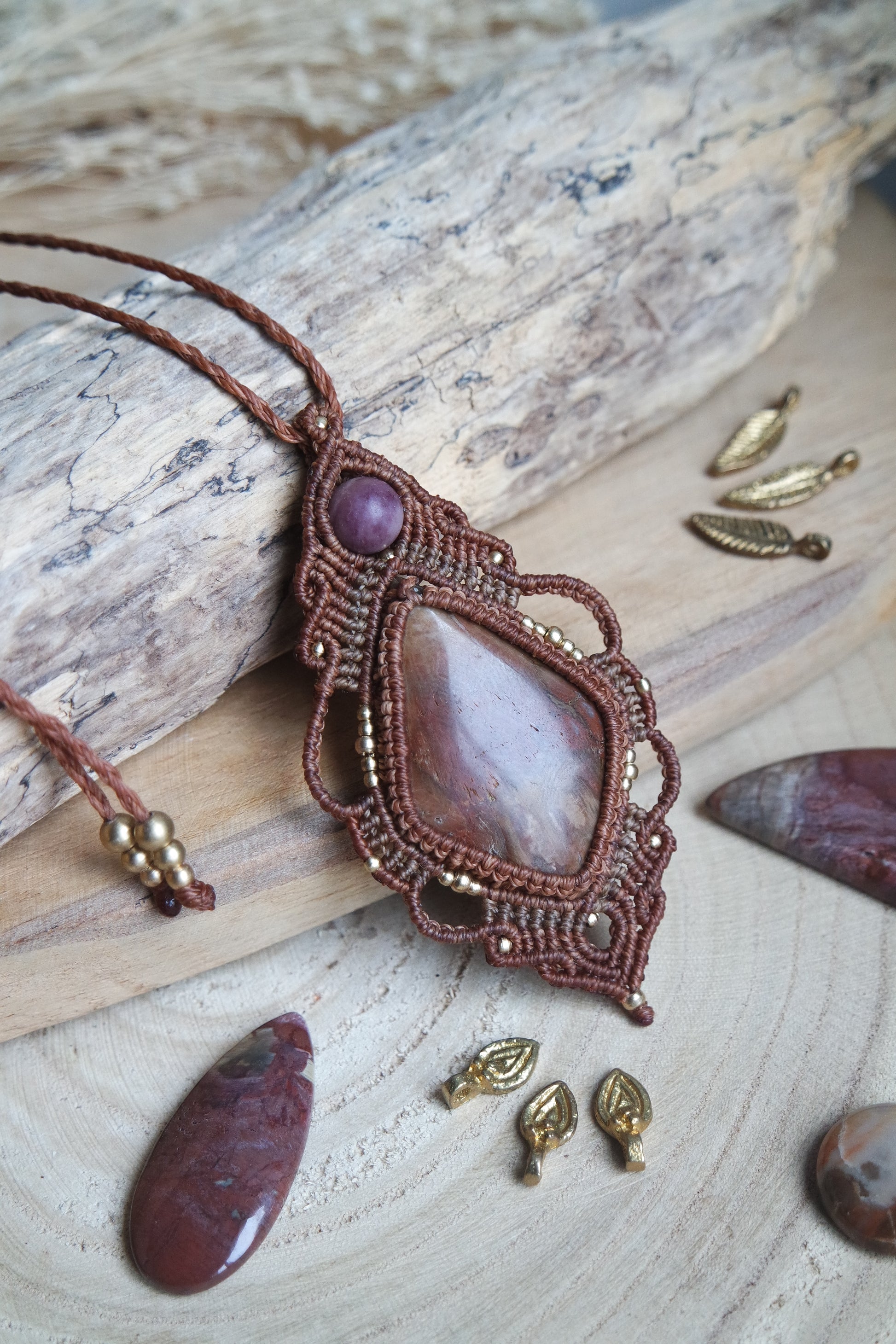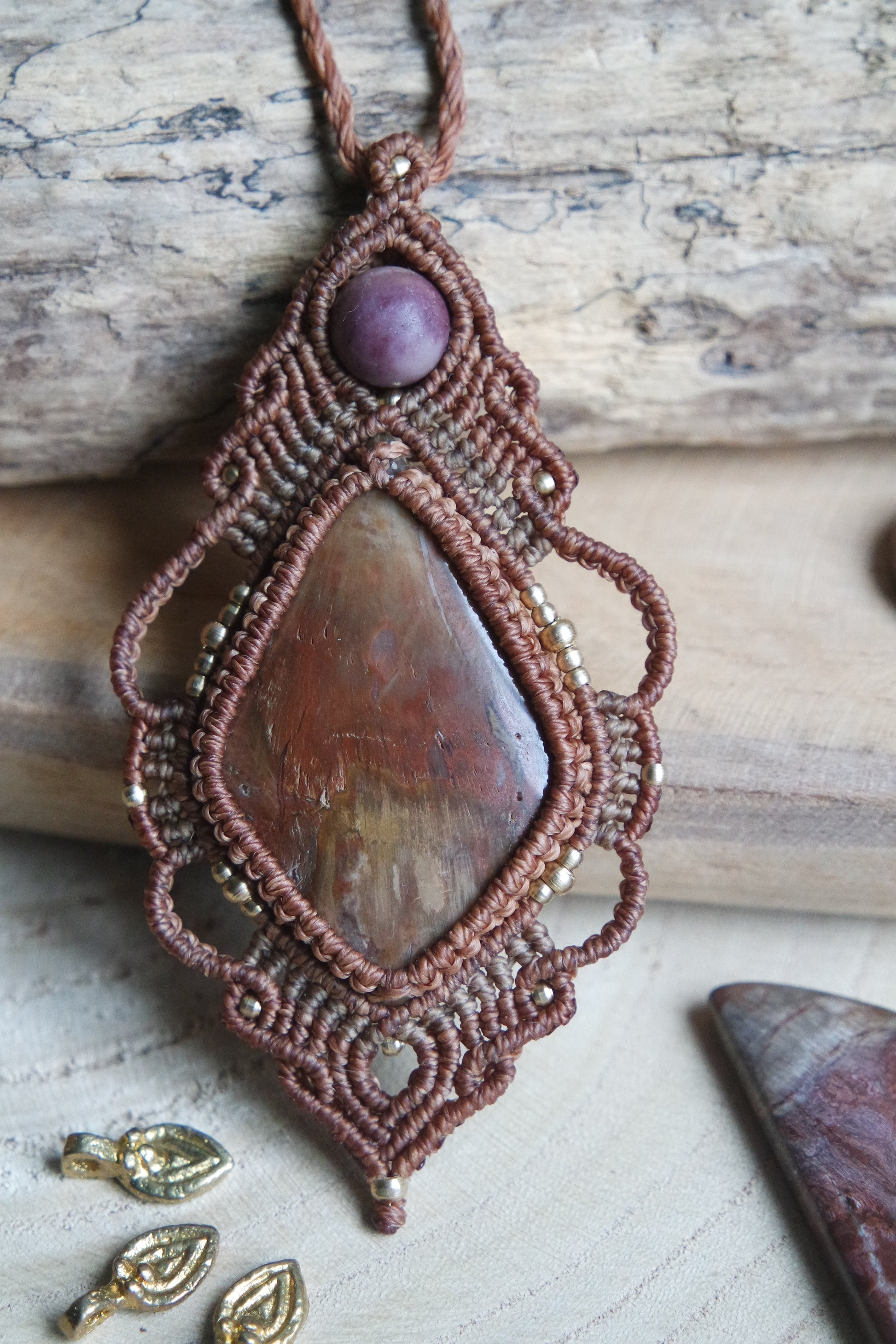 Versteinertes Holz Makramee Kette ~ Feuer