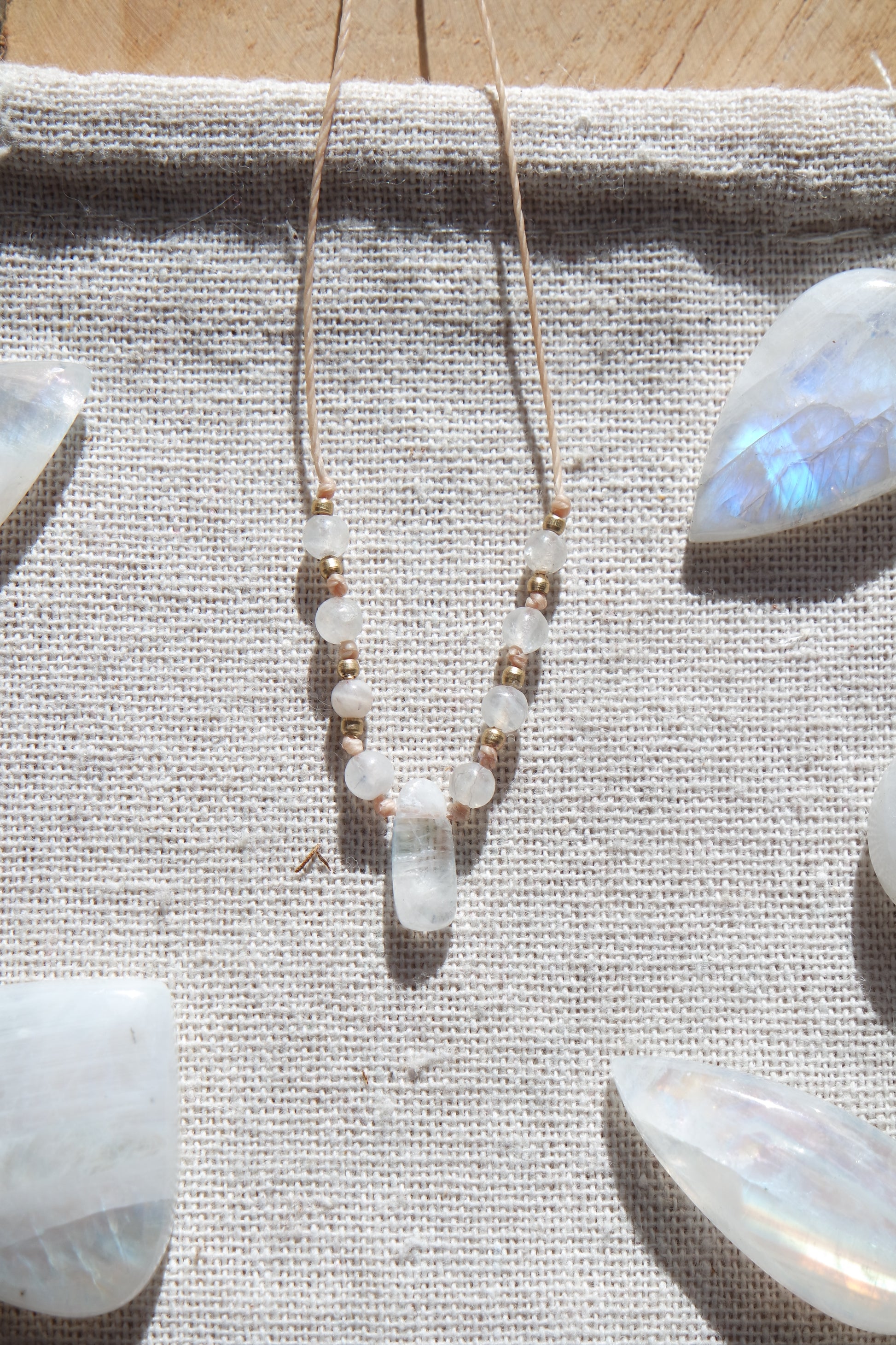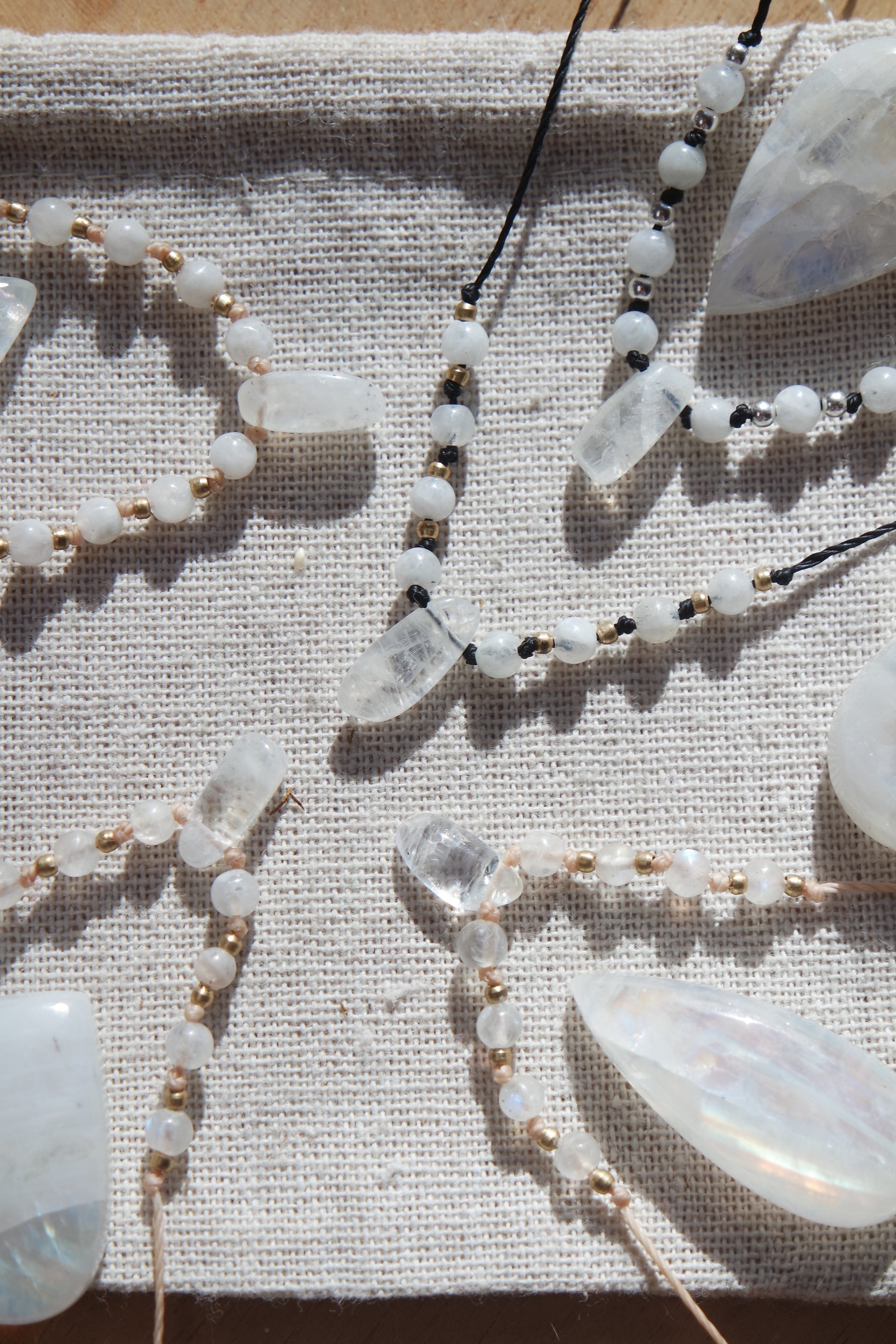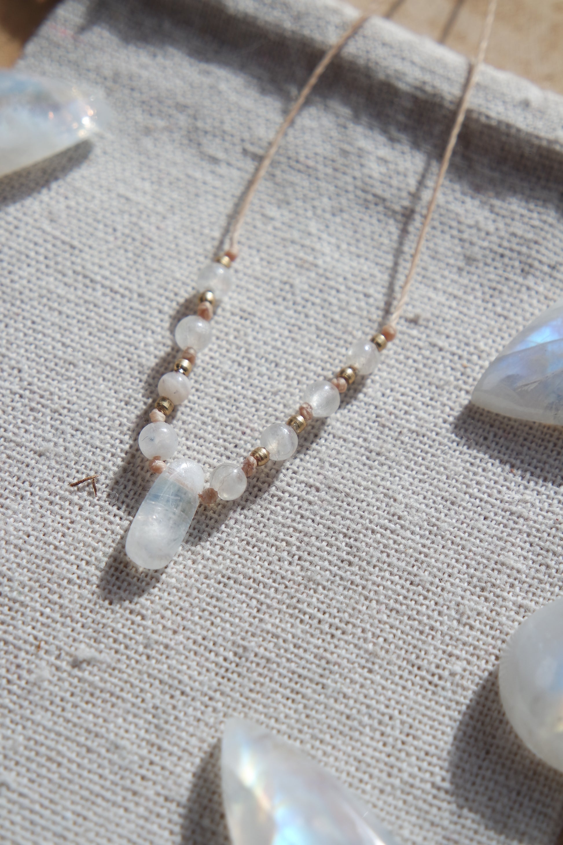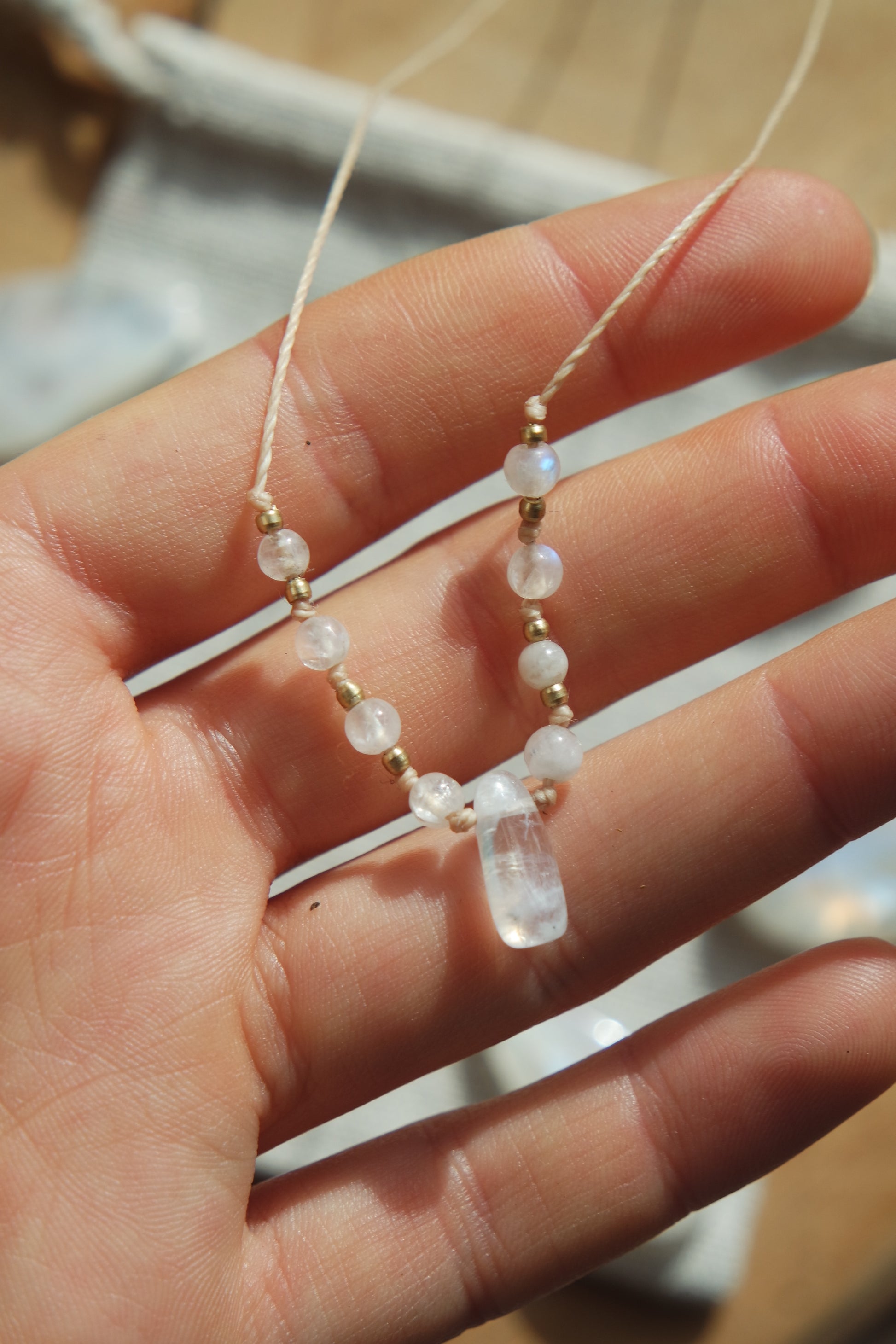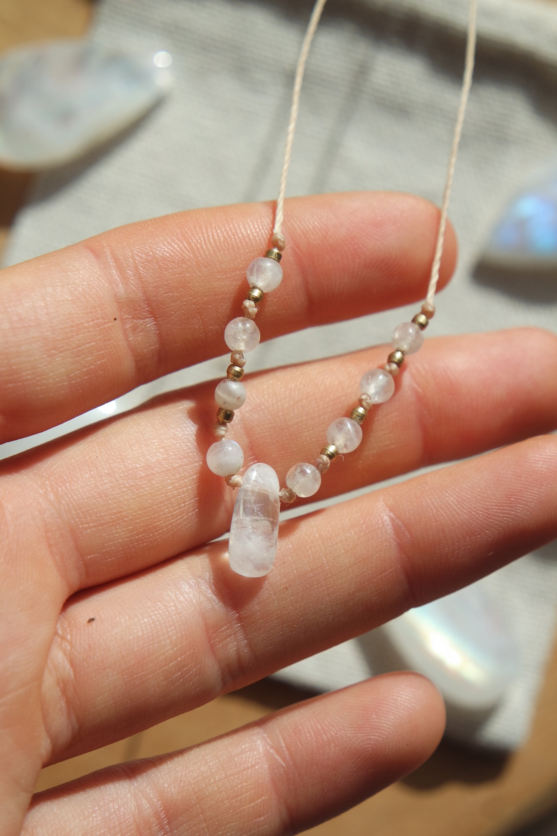 Sanft und klar wie ein Sonnenstrahl im Morgengrauen – diese Kette vereint Schlichtheit mit feinem Glanz. Der weiße Labradorit zeigt je nach Licht einen zarten, irisierenden Schimmer, der an Reflexion und Leichtigkeit erinnert.